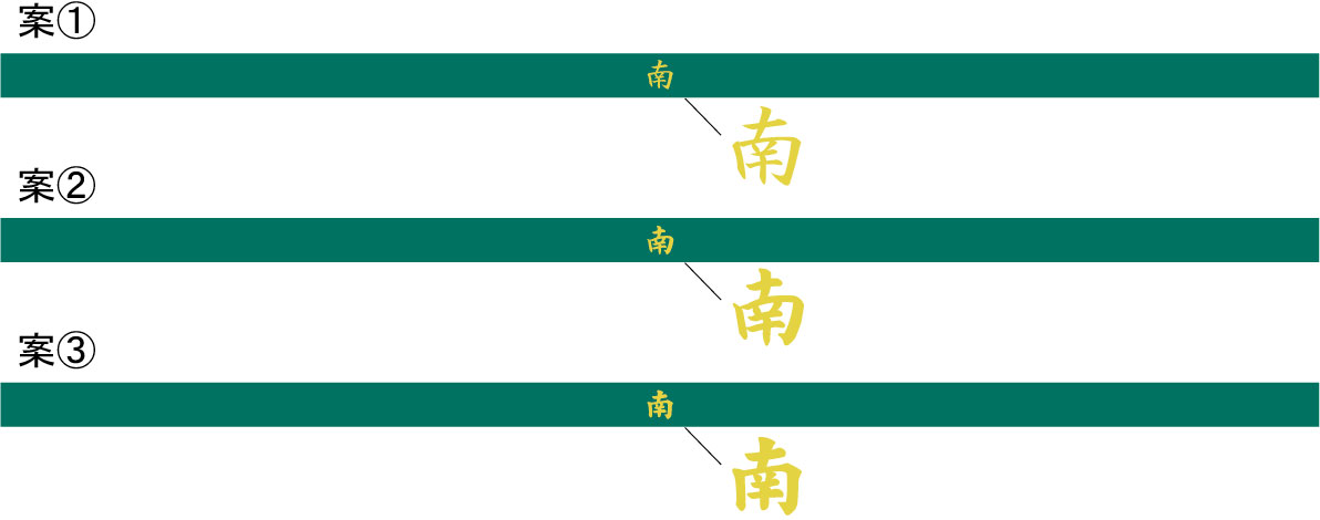ハチマキの仕上がりイメージを作成しました。ハチマキの大きさは4cm幅×長さ120cm、木綿100%の定番カラーはちまきを使用します。ハチマキのベースカラーは緑、文字の色は金色です。原稿の内容は額部分に「南」の1文字を金で印刷します。文字の書体は楷書体をご希望とのことですので、文字の太さを変えて3パターンの原稿案を作成しております。ご検討のほどよろしくお願いいたします。